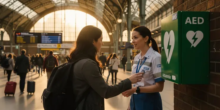 Defibrillators are increasingly available in public places across the UK, including shopping centres, train stations, and airports. These are often marked with a green sign showing a heart with a lightning bolt. Ask bystanders if they know the location of the nearest defibrillator, or consult public access maps. Some locations may also have signs indicating the presence of a nearby device.